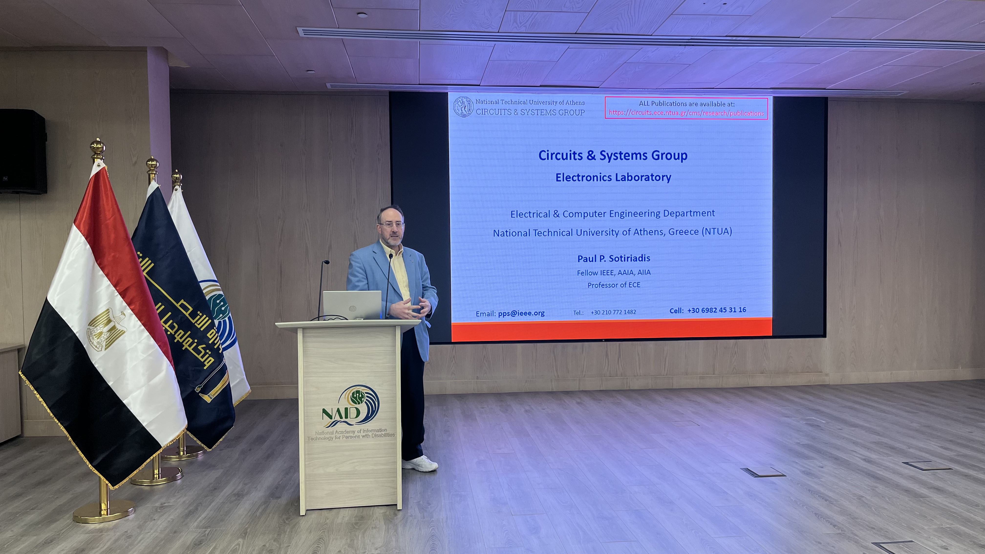 The Faculty of Engineering, in collaboration with the Information Technology Industry Development Agency (ITIDA) and the National Academy of Information Technology for Persons with Disabilities (NAID), organized a high-level academic session featuring Prof. Paul-Peter P. Sotiriadis, Professor of Electrical and Computer Engineering at the National Technical University of Athens and the Archimedes/Athena Research Center, Greece.