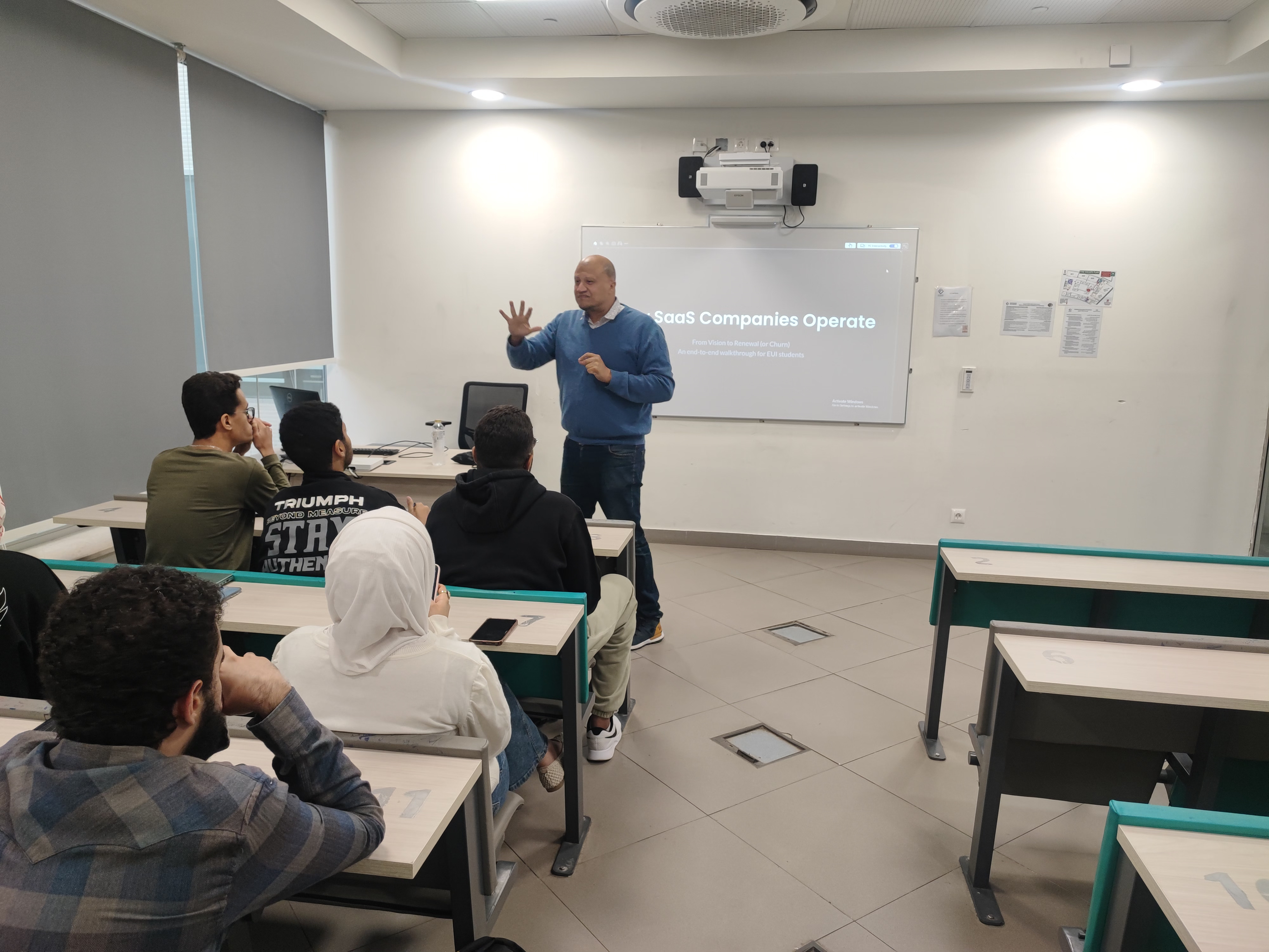 During the session, Mr. El Sherif provided students with an in-depth look into the structure and operations of SaaS companies, explaining how cross-functional teams collaborate to build and scale digital products. Students worked in groups to develop and present innovative SaaS concepts, including a Pet Life Management System, a Student Portal Platform, a Healthy Cooking application, and a Public Transportation Tracker.