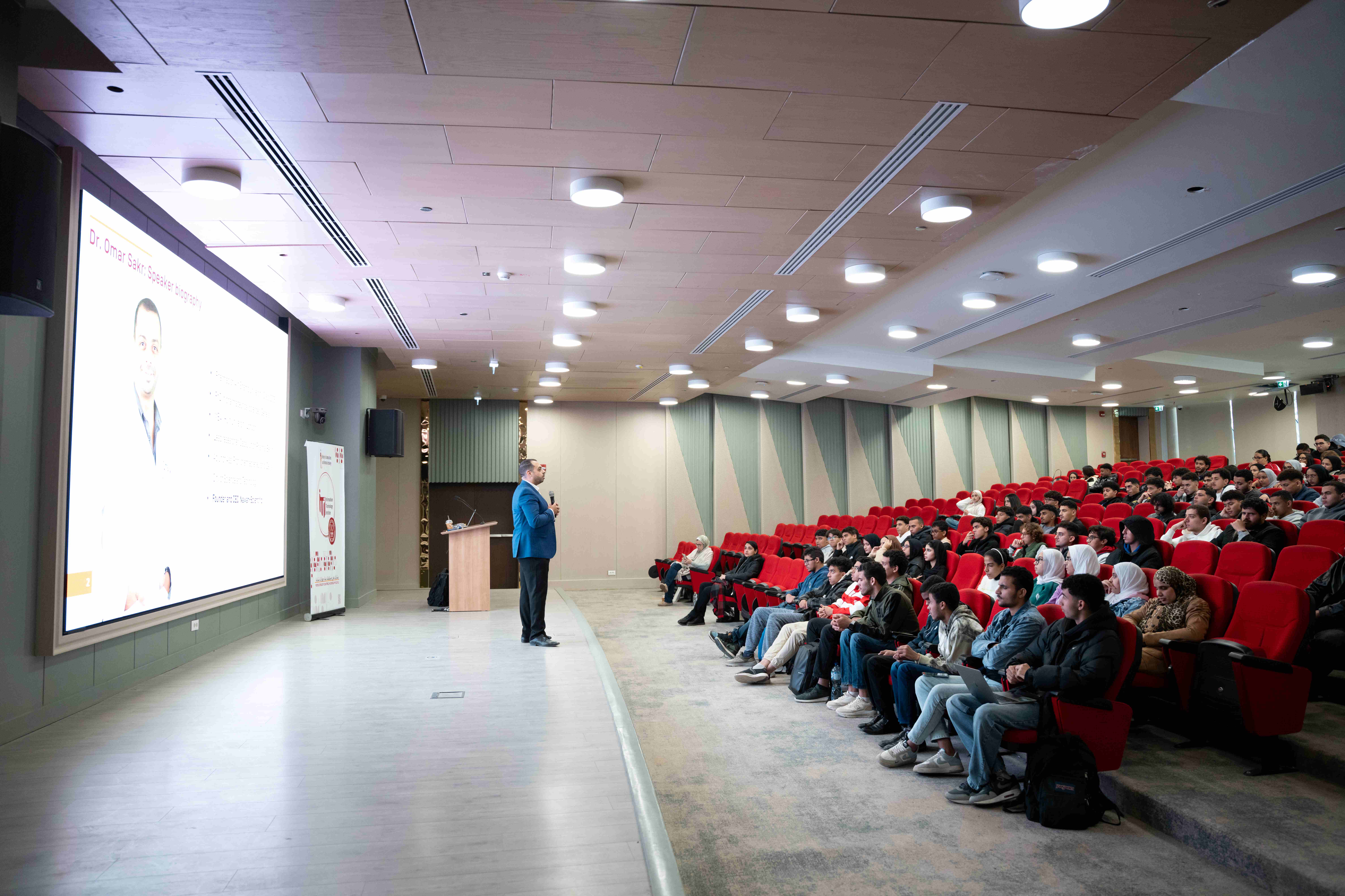 The Faculties of Computing & Information Sciences and Business Informatics hosted a special session featuring Dr. Omar Sakr, Founder and CEO of Nawah Scientific. Dr. Sakr delivered an engaging talk titled “Pitch to Raise: The Art and Science Behind a Successful Investor Pitch,” offering students valuable insights into the strategies, structure, and mindset needed to secure investment.