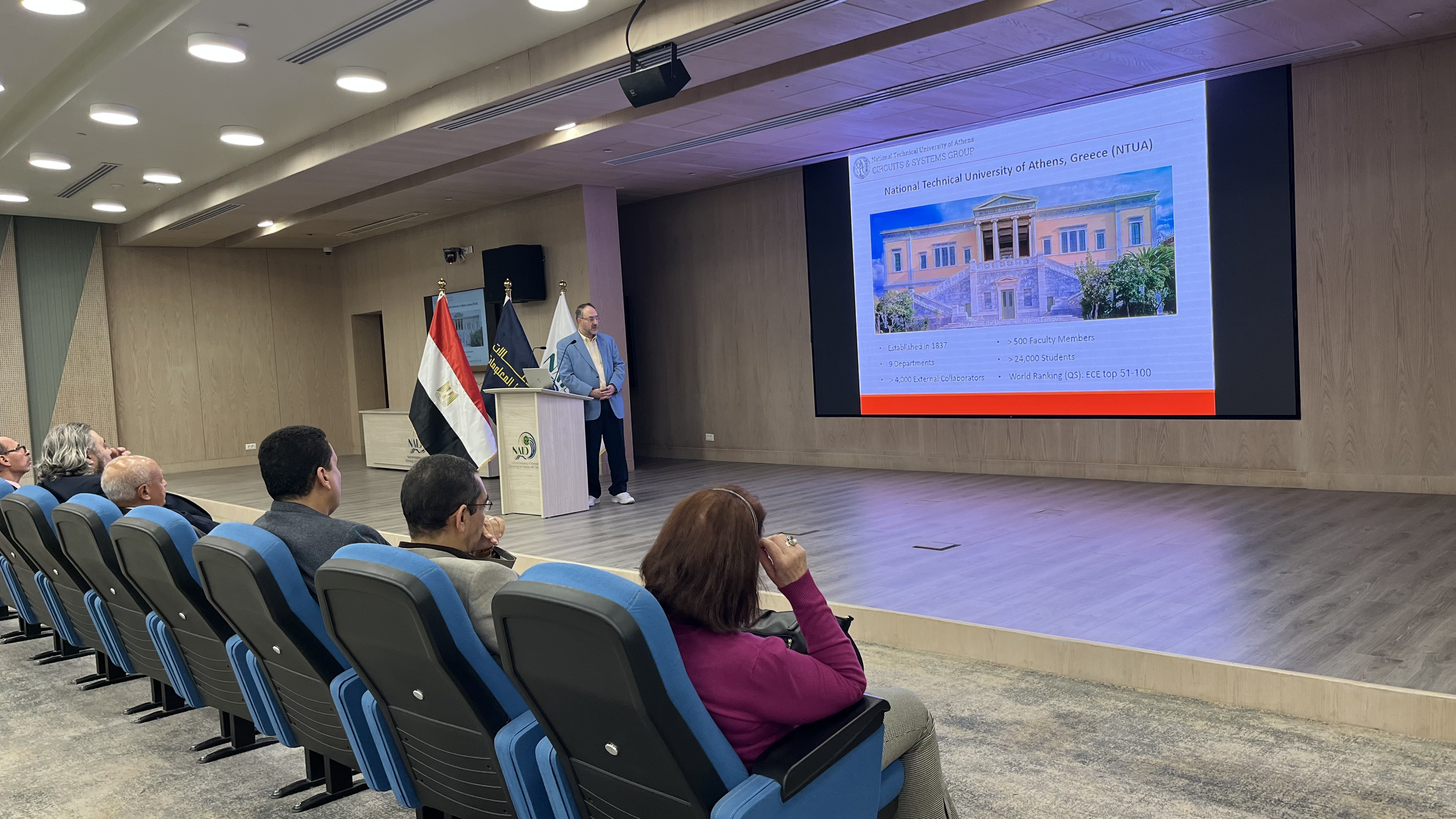 The Faculty of Engineering, in collaboration with the Information Technology Industry Development Agency (ITIDA) and the National Academy of Information Technology for Persons with Disabilities (NAID), organized a high-level academic session featuring Prof. Paul-Peter P. Sotiriadis, Professor of Electrical and Computer Engineering at the National Technical University of Athens and the Archimedes/Athena Research Center, Greece.